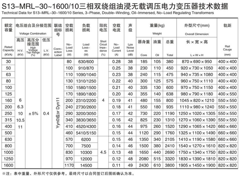 S9-160KVA/10KV油浸式电力变压器规格参数: